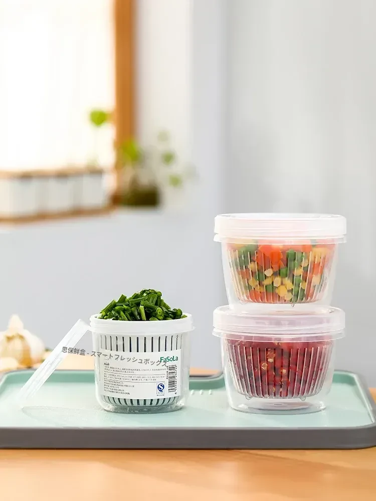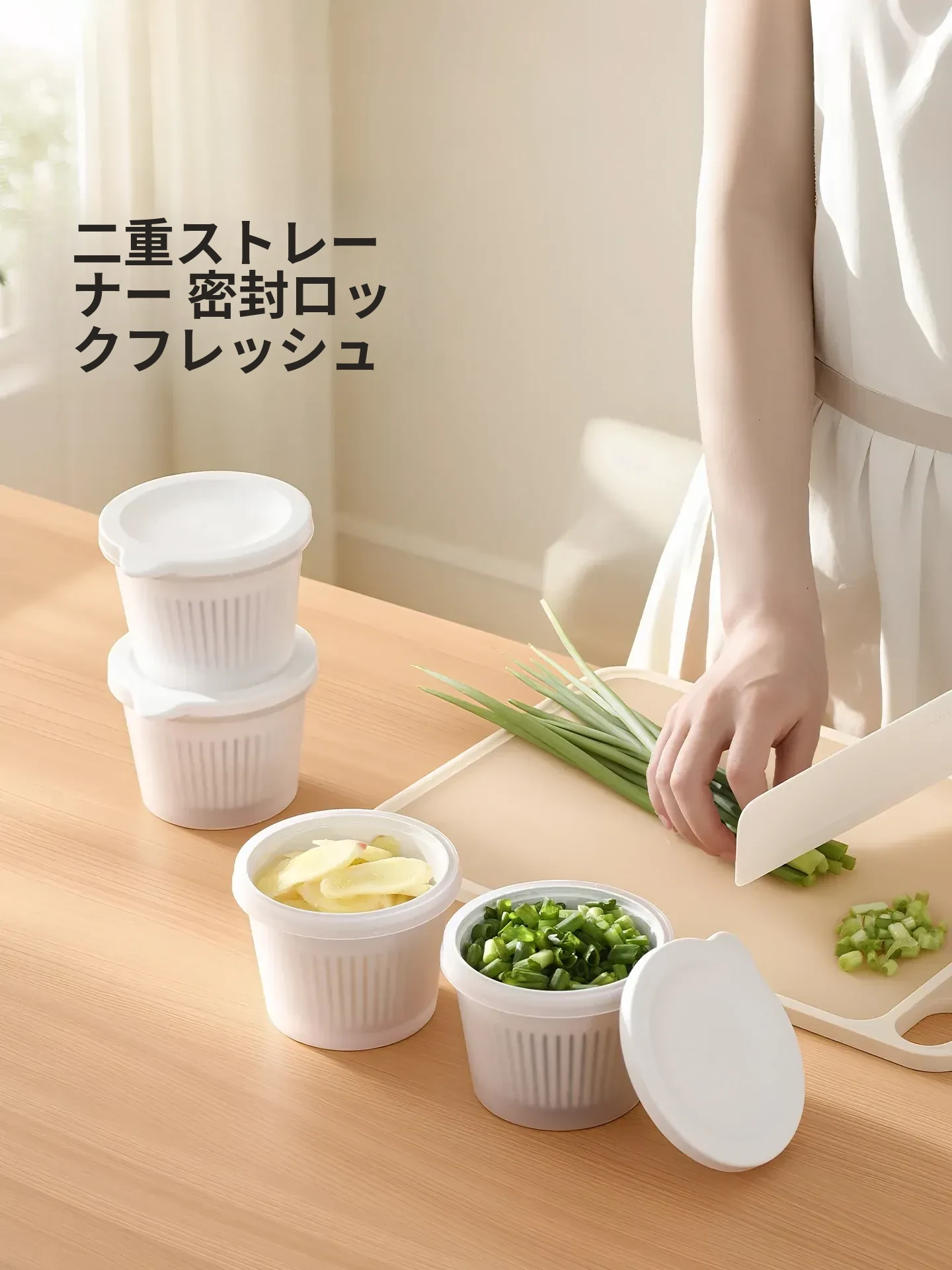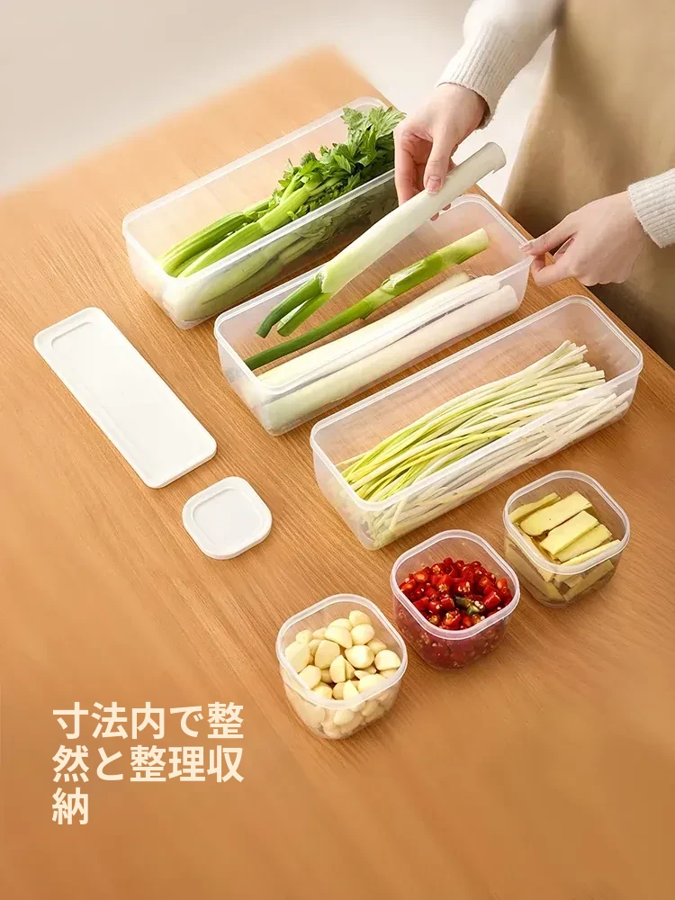 FaSoLaキッチン用透明ネギ・生姜・ニンニク収納ボックス - 冷蔵庫でのフレッシュ保存に最適!香味野菜や刻みニンニクを分けて保管できる食品グレードの水切りボックス。料理の効率をアップさせ、毎日の食卓を彩ります!