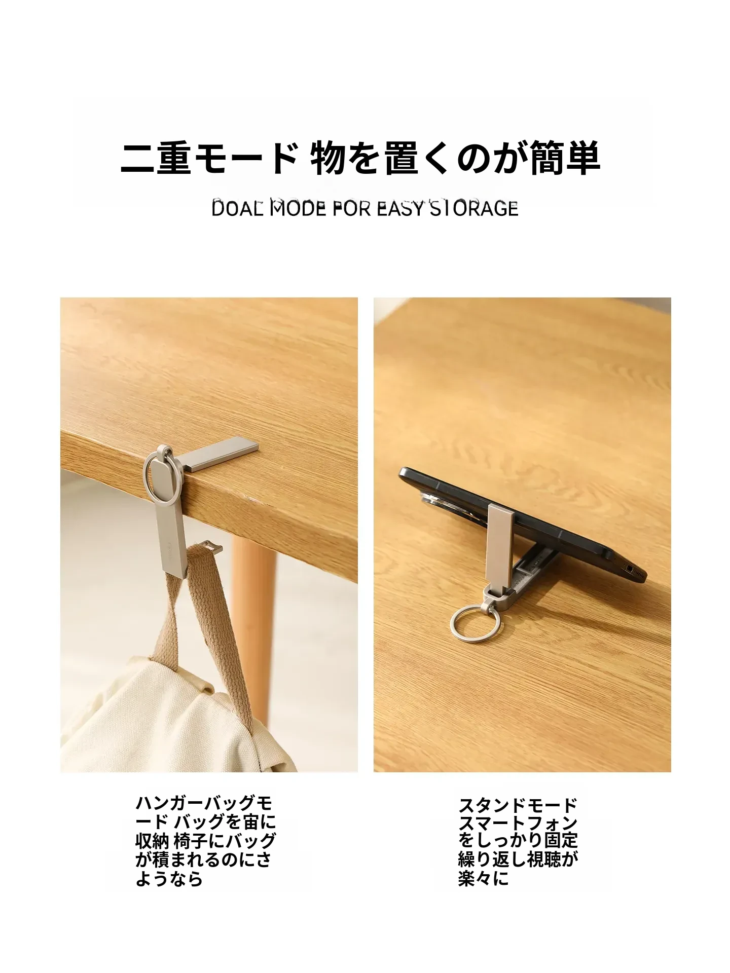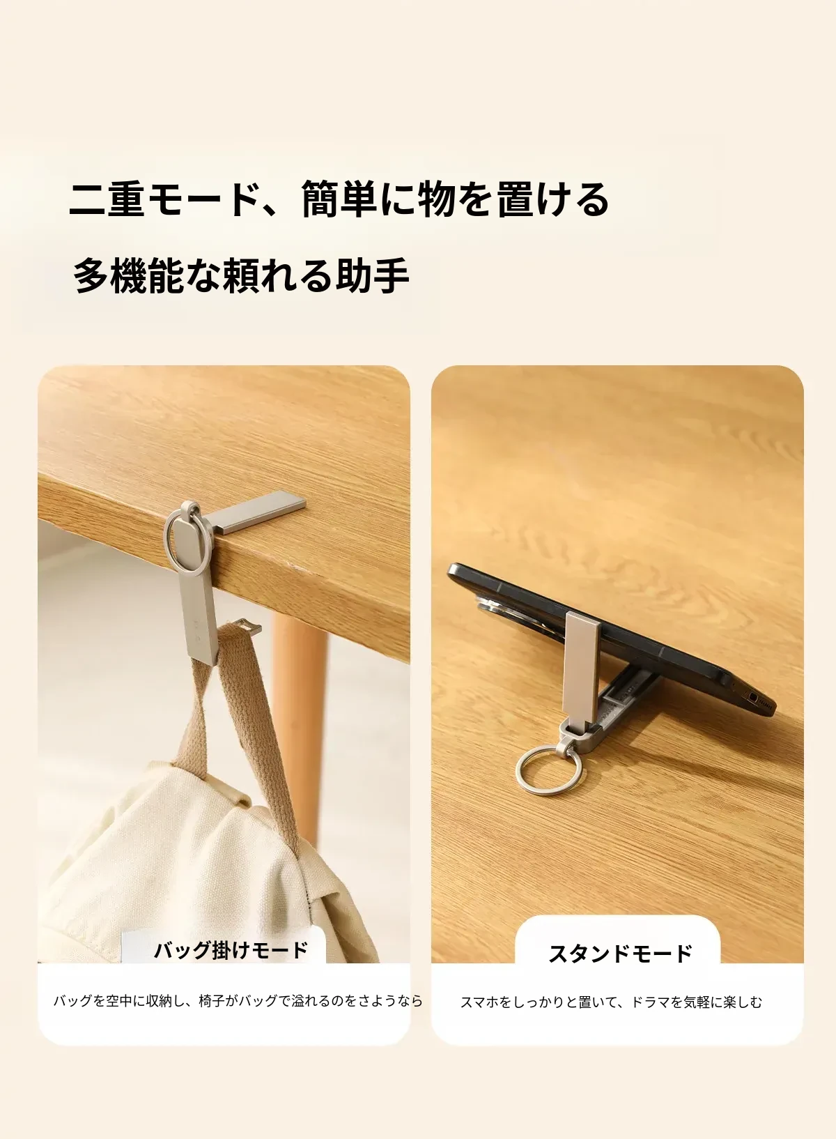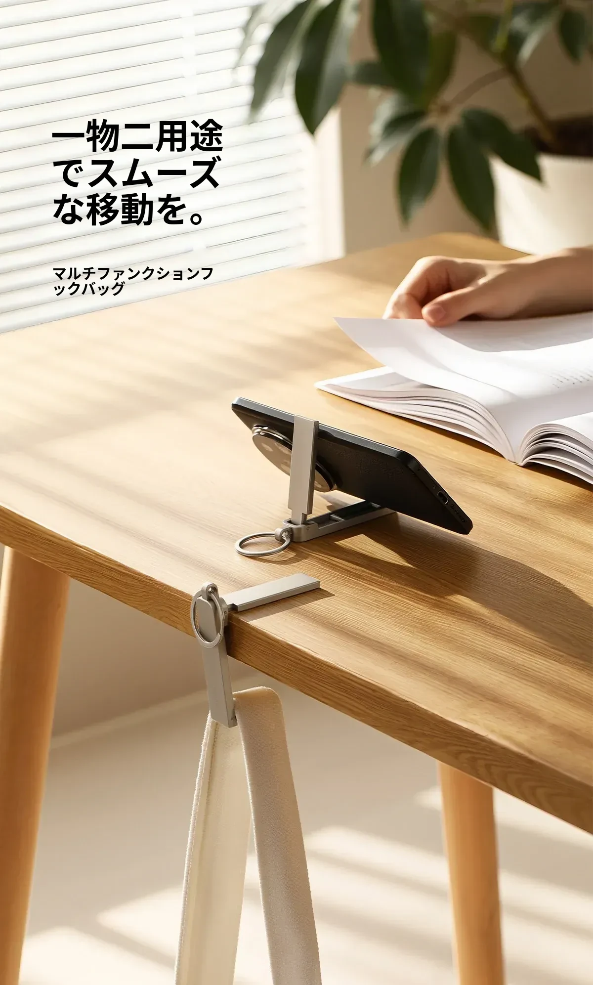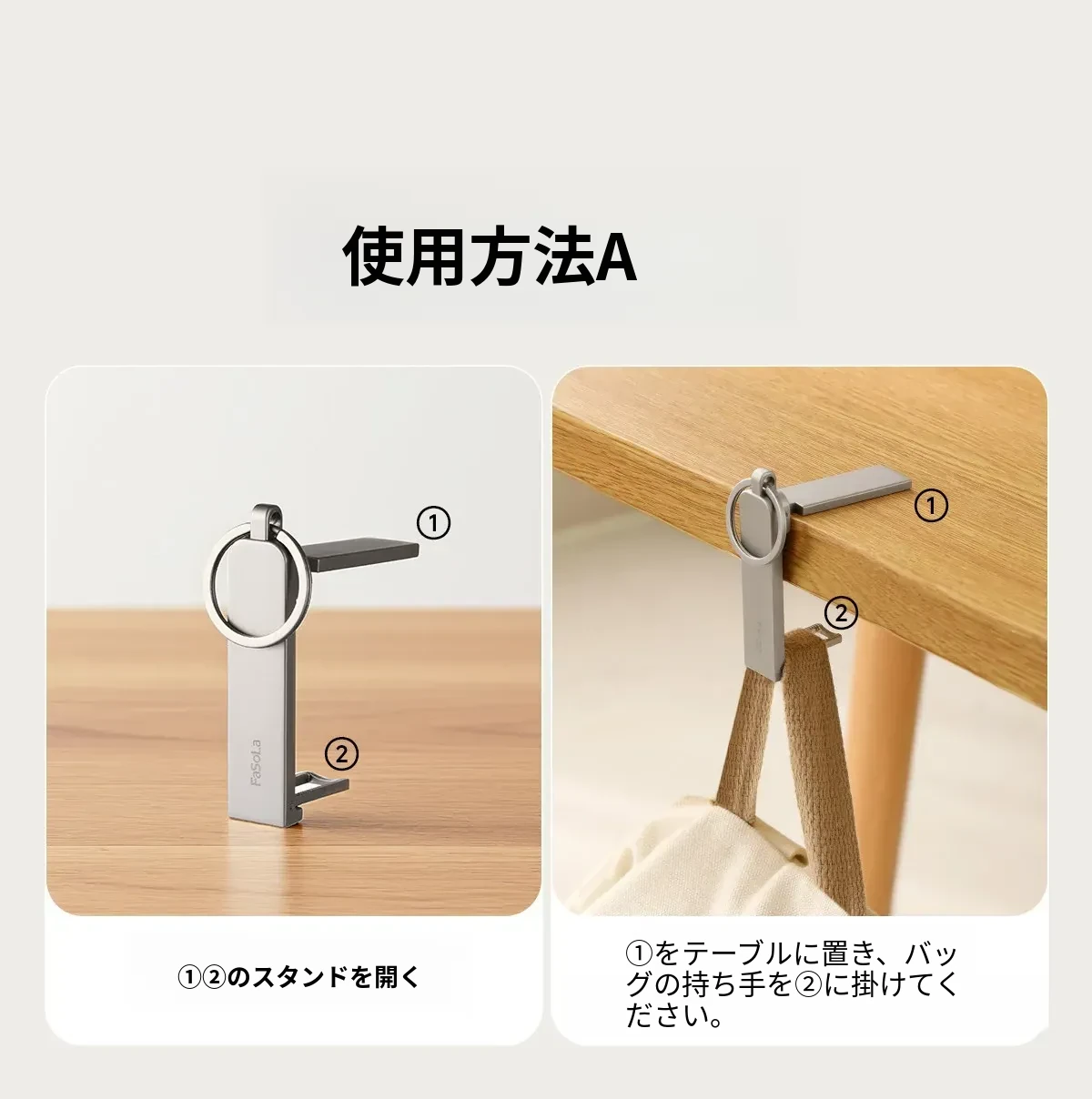 FaSoLa デスクサイドフック 〜 簡単取り付け、オフィスや自宅でのバッグ掛けに最適!多機能スマホスタンド付き、コンパクトで持ち運び便利なアイテムです。