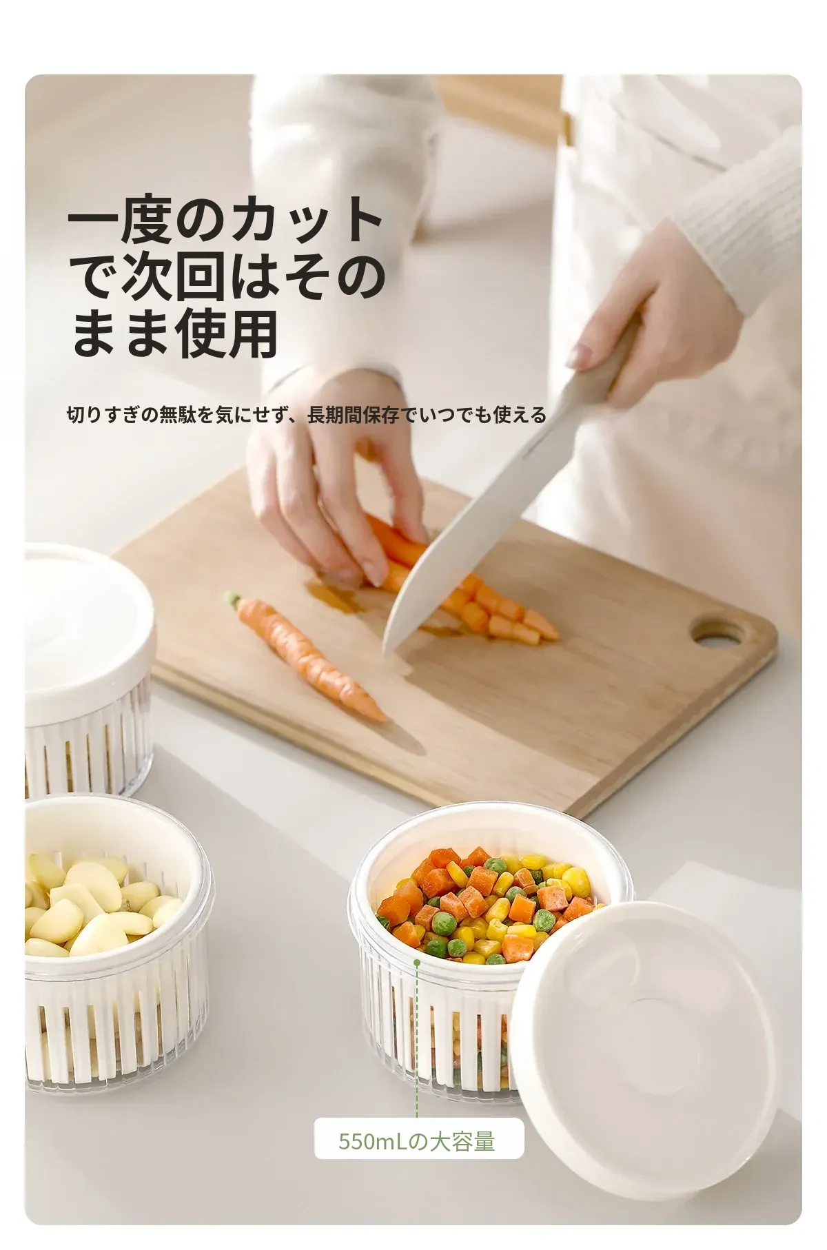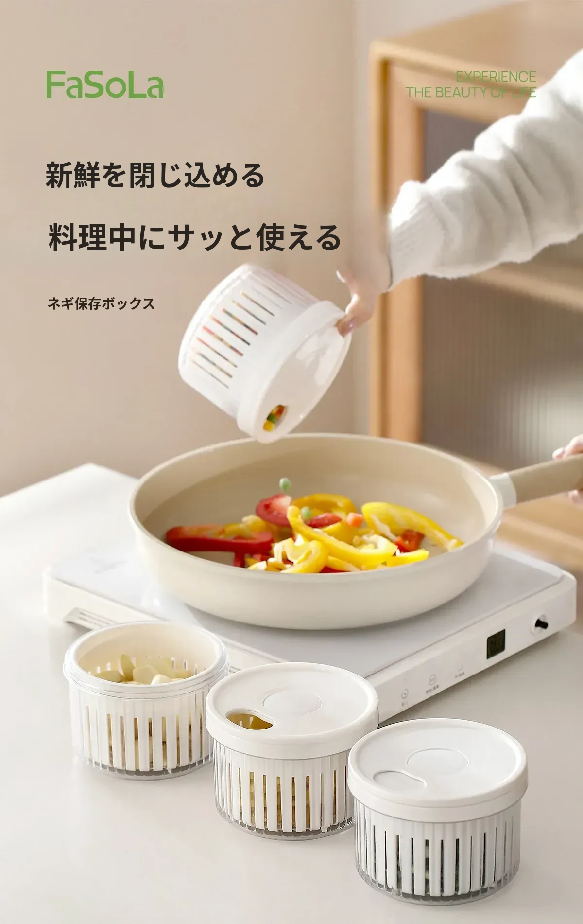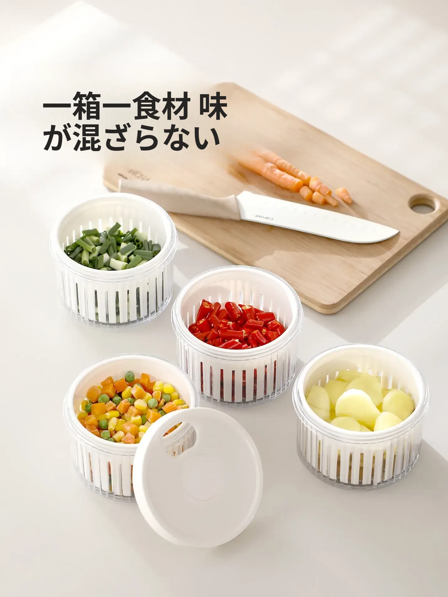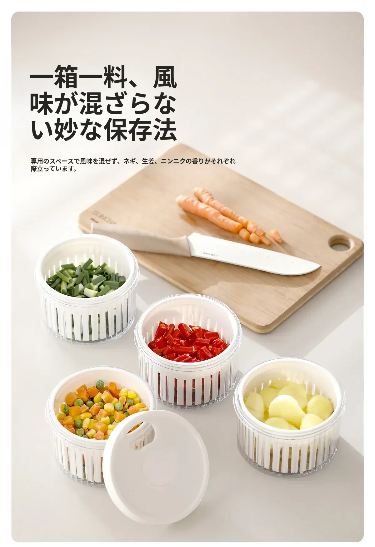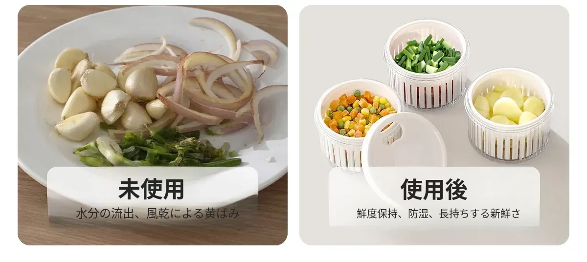 FaSoLaネギ&香味野菜保存ボックス - ネギ、ショウガ、ニンニク、唐辛子を新鮮に保つ密閉収納容器!キッチン専用、下ごしらえも簡単、便利な水切り機能付きで、料理の準備がもっと楽しく!
